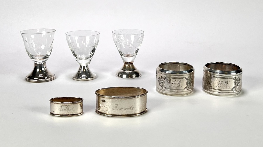 Tafelzilver uit de Art Deco periode, vervaardigd uit 835 zilver en kristalglas. Vier servetringen met gegraveerde cartouches en florale motieven, evenals drie borrelglaasjes op een conische zilveren voet. De voorwerpen zijn voorzien van Nederlandse zilvermerken en herinneringsdata. Datering eerste helft van de 20e eeuw en een herkomst in Nederland.