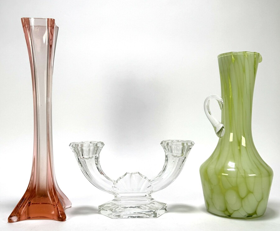 Glaswerk vervaardigd uit mondgeblazen glas; een groene vaas met gemarmerd decor en aangezet oor, een transparante tweearmige kandelaar met gefacetteerde voet en een hoge vaas met roze kleurverloop en vierlobbig gevormde voet. Datering 20e eeuw en een Europese herkomst.