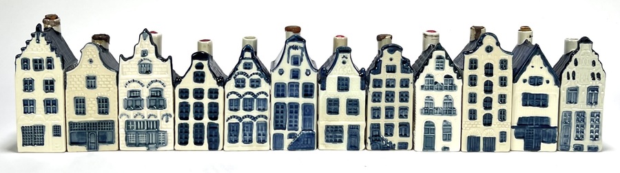 KLM huisjes van Blue Delft's in oud-Hollandse stijl, vervaardigd uit aardewerk. De twaalf miniaturen tonen historische grachtenpanden met diverse trap- en klokgevels. Gemerkt aan de onderzijde Rynbende Distilleries. De KLM huisjes dateren uit omstreeks 1960 en hebben een Nederlandse herkomst.