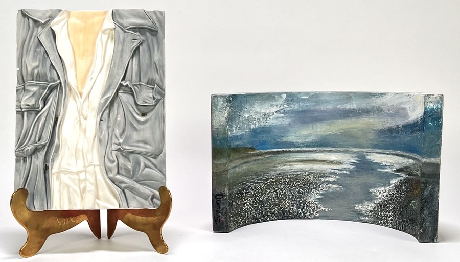 Een keramische wandtegel met een figuratief herenkostuum in reliëf en een halfronde houten schildering met een geschilderd kustlandschap. De schildering is voorzien van een onduidelijke signatuur aan de zijkant. De tegel en schildering dateren uit circa 2000 en hebben een Europese herkomst.