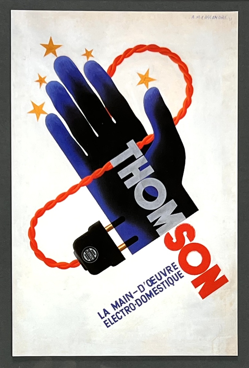 Affiche van A.M. Cassandre (1901–1968) toont een gestileerde blauw-zwarte hand met elektrische stekker en rode gevlochten kabel in Art Deco stijl, gedrukt op papier naar het ontwerp uit 1931. In de plaat gesigneerd rechtsboven “A.M. Cassandre 31”. De herdruk dateert uit eind 20e eeuw en heeft een Franse herkomst.