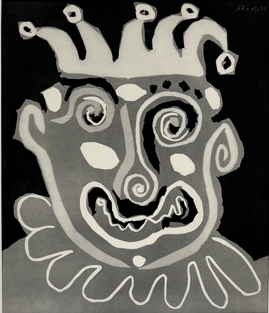 Heliogravure door Pablo Picasso (1881–1979) toont een geabstraheerd koningsportret getiteld "Le Vieux Roi" in surrealistische stijl, uitgevoerd als heliogravure op papier. De gravure is gebaseerd op een linosnede uit 1963 en kenmerkt zich door witte lijnvoering tegen een zwarte achtergrond. Deze prent is uitgegeven door S.P.A.D.E.M. en Cosmopress Genève. Deze prent dateert uit het laatste kwart 20e eeuw en heeft een Franse herkomst.