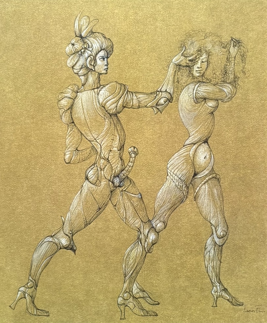 Prent door Leonor Fini (1907–1996) uit de surrealistische periode, vervaardigd uit Vélin-papier met gemengde druktechniek. De voorstelling uit de serie "Fruits de la Passio" toont twee gestileerde figuren met erotische symboliek tegen een goudkleurige fond. Gesigneerd in de plaat rechtsonder, de prent dateert uit circa 1980 en heeft een Franse herkomst via Editions des Maîtres du XXe Siècle te Parijs.
