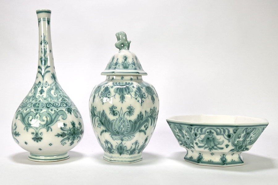 Lot aardewerk van De Porceleyne Fles met handgeschilderd Delvert groen decor; een flesvaas, dekselpot met leeuwtje en een achthoekige kom. De set dateert uit 1969–1974 en heeft een Nederlandse herkomst. Alle delen zijn aan de onderzijde volledig gemerkt.
