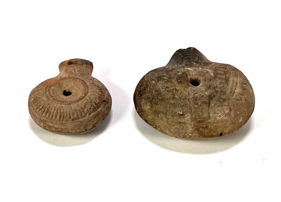 Romeinse terracotta olielampjes, 2e-4e eeuw n. Chr., vermoedelijk oostelijk Middellandse Zeegebied, uit matrijs gevormd. Een exemplaar heeft een rond lichaam met geribde schouderzone en korte tuit; het andere exemplaar is breder, met vlakke discus, centrale vulopening en plastisch gemodelleerde schouderbanden. Beide volgen het gangbare lucerna-type uit de Midden-Keizerlijke periode. Aan de onderzijde zijn ingedrukte basisringen zichtbaar. Europese privécollectie.