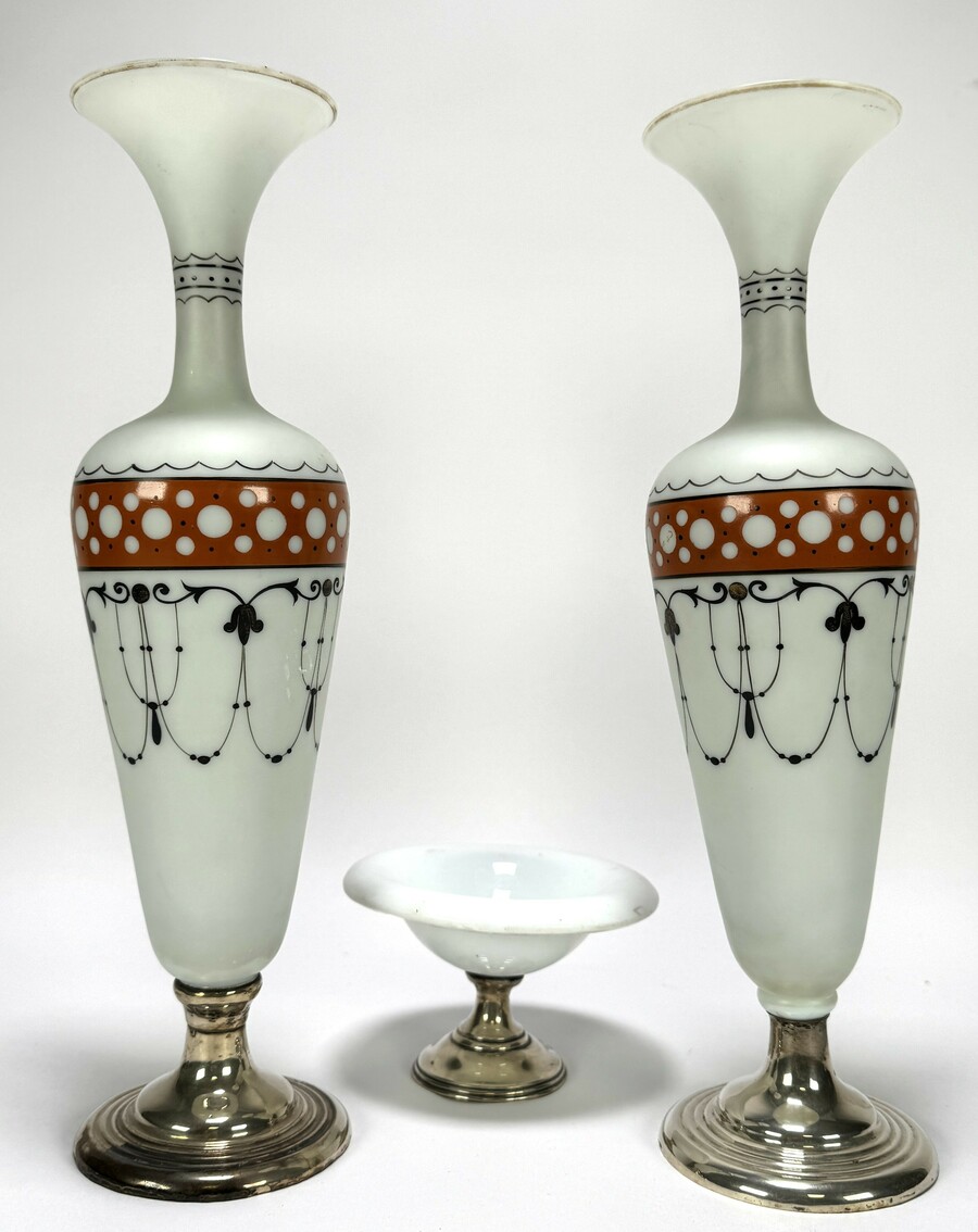 Vazen uit de Art Deco periode, vervaardigd uit wit opaalglas met handgeschilderd geometrisch decor. De balustervormige vazen tonen een brede donkeroranje band met witte cirkels, aangevuld met zwarte guirlandes en gestileerde florale motieven. De vazen rusten op geprofileerde metalen voeten en dateren uit circa 1930. Hierbij een schaaltje vervaardigd uit wit opaalglas met een geprofileerde metalen voet.