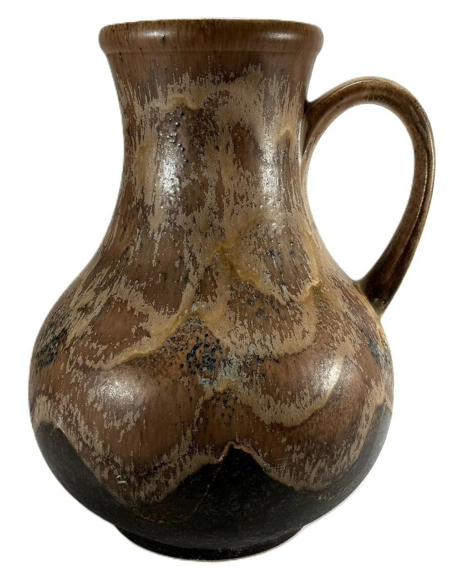 Schenkkan van Dümler & Breiden, vervaardigd uit keramiek en glazuur. De balustervormige schenkkan toont een patroon van beige en okerkleurige tinten op een donkere fond. Gemerkt aan de onderzijde met modelnummer 038/40 en fabrieksmerk. De schenkkan dateert uit de jaren 1960 en heeft een West-Duitse herkomst.