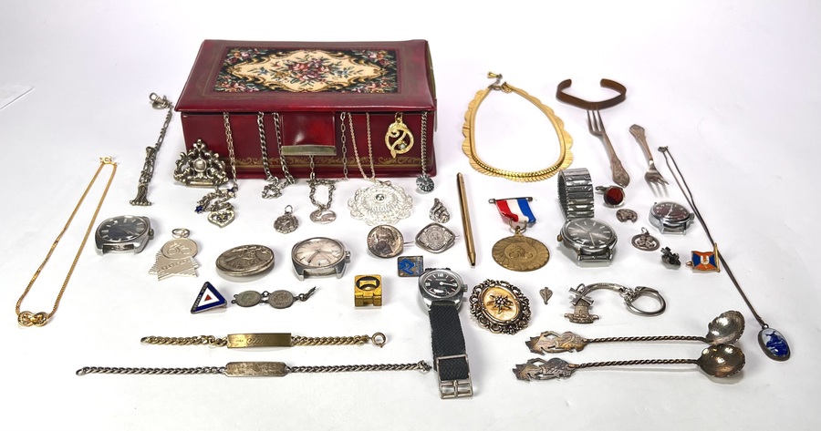 Lot sieraden en curiosa bestaande uit onder andere vintage horloges, armbanden, kettingen, zilverkleurig bestek en een bordeauxrode sieradendoos met floraal tapisserie-inzetstuk. Datering tweede helft 20e eeuw.