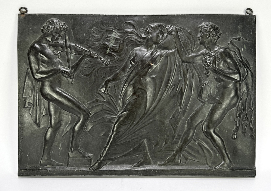 Art Nouveau plaquette van Frederik Engel Jeltsema (1879–1971), vervaardigd uit gepatineerd brons in bas-reliëf. De allegorische voorstelling genaamd "Bachchanaal" toont een dansende vrouw, omringd door een muzikant met een viool en een man met een druiventros en jachtwild. Linksonder in reliëf gesigneerd en gedateerd met F.E. Jeltsema 1905.