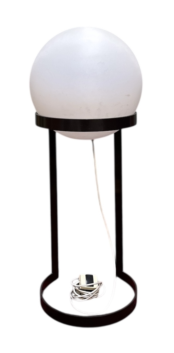 Space Age vloerlamp, vervaardigd uit verchroomd metaal met een melkglazen kap. De lamp toont een gestroomlijnde vormgeving met een karakteristieke trompetvoet en een slanke opgaande stam. Daterend uit de jaren zestig/zeventig van de twintigste eeuw, Europese herkomst.