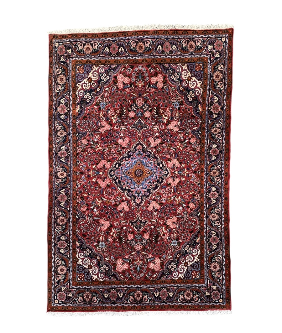 Hamadan kleed vervaardigd met symmetrische Ghiordes knoop in wollen pool op katoenen schering en inslag. Het ontwerp toont een geometrisch centraal medaillon in indigo blauw op een donkerrode grond, geflankeerd door gestileerde bloemmotieven en contrasterende hoekstukken. De hoofdrand bevat een herhalend palmettenmotief. West-Perzische herkomst, midden van de 20e eeuw.