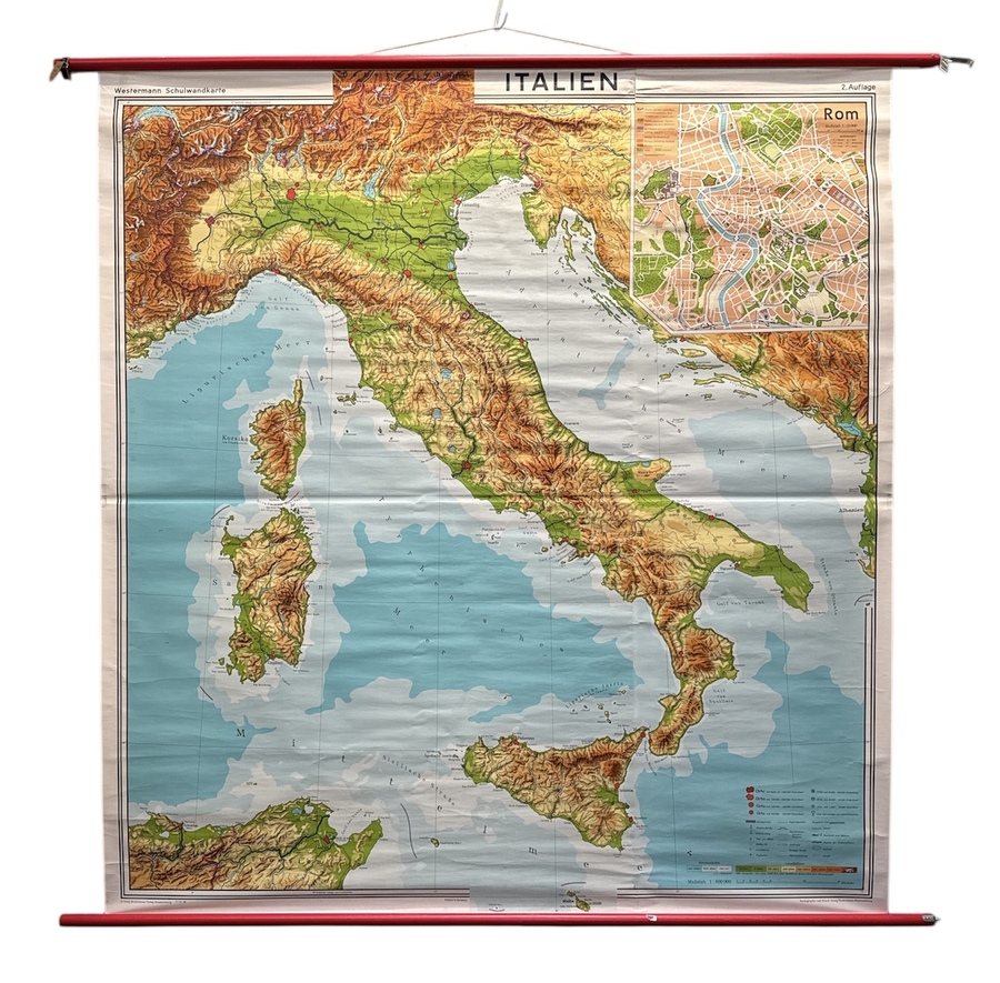 Kaart van Georg Westermann in Mid-century moderne stijl, vervaardigd uit papier op linnen met houten stokken. De gedetailleerde schoolwandkaart van Italië toont een topografische weergave inclusief inzetkaart van Rome op schaal 1:10.000. Kenmerkend zijn de rood gelakte houten rollers en de technische kleurendruk van de tweede editie. De kaart dateert uit ca. 1960 en heeft een Duitse herkomst. Gemerkt met uitgeversstempel Westermann.