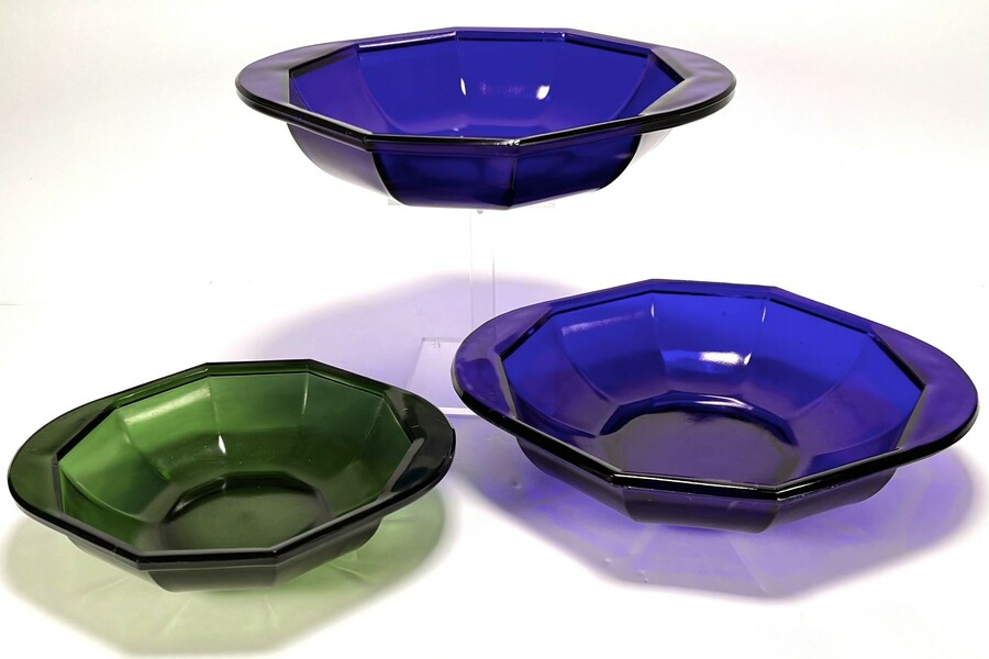 Schalen, ontwerp Karel Petrus Cornelis de Bazel (1869–1923) uit de Art Deco periode, vervaardigd uit geperst glas in kobaltblauw en smaragdgroen voor Glasfabriek Leerdam. De decagonale vormgeving met geprononceerde facetten en karakteristieke horizontale handgrepen is typerend voor de ontwerpen van De Bazel. Elke schaal toont het geperste monogram van de ontwerper op de bodem. Dit ensemble dateert van circa 1920 en heeft een Nederlandse herkomst.