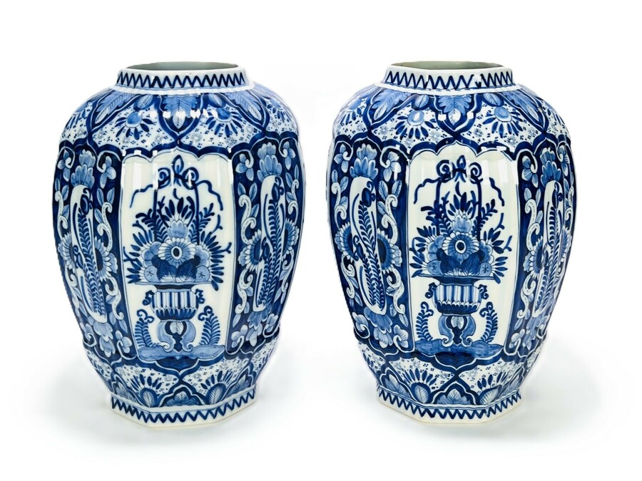 Paar aardewerk Delfts blauwe vazen, uitgevoerd in balustervorm en gedecoreerd met florale cartouches, bladmotieven en geometrische randornamenten in kobaltblauw onder glazuur. De vazen vormen een stel en vertonen lichte variaties in handbeschildering. Voorzien van geschilderde merken aan de onderzijde. Vervaardigd in Nederland in het midden van de 20e eeuw.