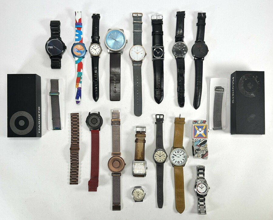 Horloges van diverse makers in modernistische stijl, vervaardigd uit edelstaal en kunststof met quartz-uurwerken. De verzameling bevat innovatieve Magneto modellen met magnetische uur aanduiding en modemerken zoals Tommy Hilfiger. De set is voorzien van diverse lederen en metalen banden in uiteenlopende kleurcombinaties. Deze horloges dateren uit de tweede helft van de 20e eeuw en begin 21e eeuw en hebben een internationale herkomst.