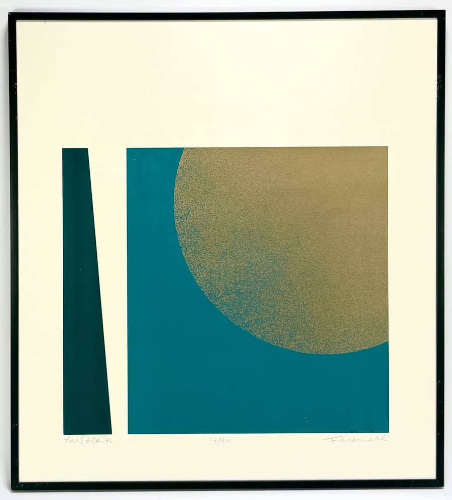 Zeefdruk door Ted Felen (1931–2016), getiteld "Farewell", toont een abstracte compositie in modernistische stijl, uitgevoerd in zeefdruk op papier. De voorstelling kenmerkt zich door een centraal okergeel cirkel tegen diepblauwe kleurvlakken. Rechtsonder getiteld, midden onder genummerd 17/90 en linksonder gesigneerd en gedateerd. De zeefdruk dateert uit 1992 en is voorzien van een zwarte lijst.