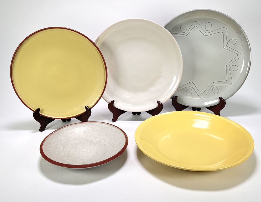 Schalen en borden vervaardigd uit aardewerk met diverse glazuurtechnieken. De verzameling bevat werk van pottenbakkerijen Erica, Mobach, De Vier Paddenstoelen en Fris Edam, gekenmerkt door organische vormgeving en een palet van okergeel, grijs en crème wit. Datering tweede helft 20e eeuw en een Nederlandse herkomst.