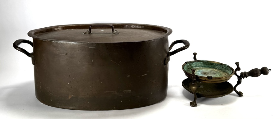 Koperen pan met een driepootschaal vervaardigd uit rood metaal met ambachtelijk geklonken messing handvatten. De pan heeft een ingeslagen merkteken met de initialen L.E.D. De koperen pan en schaal dateren uit de 19e eeuw en hebben een West-Europese herkomst.