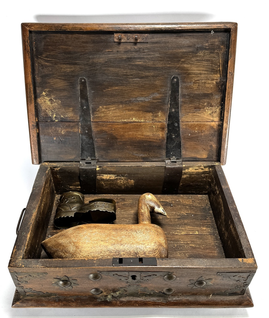 Kist vervaardigd uit hout met messing beslag, uitgevoerd in een rustieke stijl met decoratieve nagels en hoekstukken. De kist wordt vergezeld door een houten beeld van een eend en een miniatuur messing schoen. Datering eerste helft van de 20e eeuw en een West-Europese herkomst.