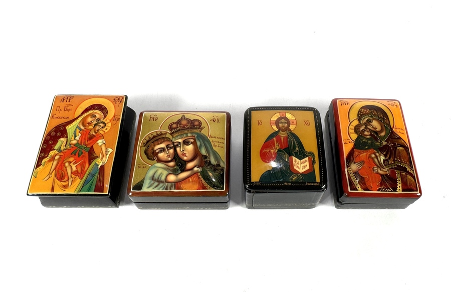 Vier handbeschilderde Russische lakwerkdoosjes, overwegend in Palekh stijl, laat 20e eeuw, uitgevoerd in tempera op papier-maché. Het kavel omvat devotionele lakwerkdoosjes met Christus Pantokrator en Maria-voorstellingen met kind, geschilderd op warme oker- en oranjerode gronden met goudaccenten. Twee doosjes zijn gesigneerd, waaronder Спас / Палех / Вишняков В.В. / Spas / Palekh / Vishnyakov V.V., alle exemplaren hebben zwart gelakte wanden en rode binnenzijden.