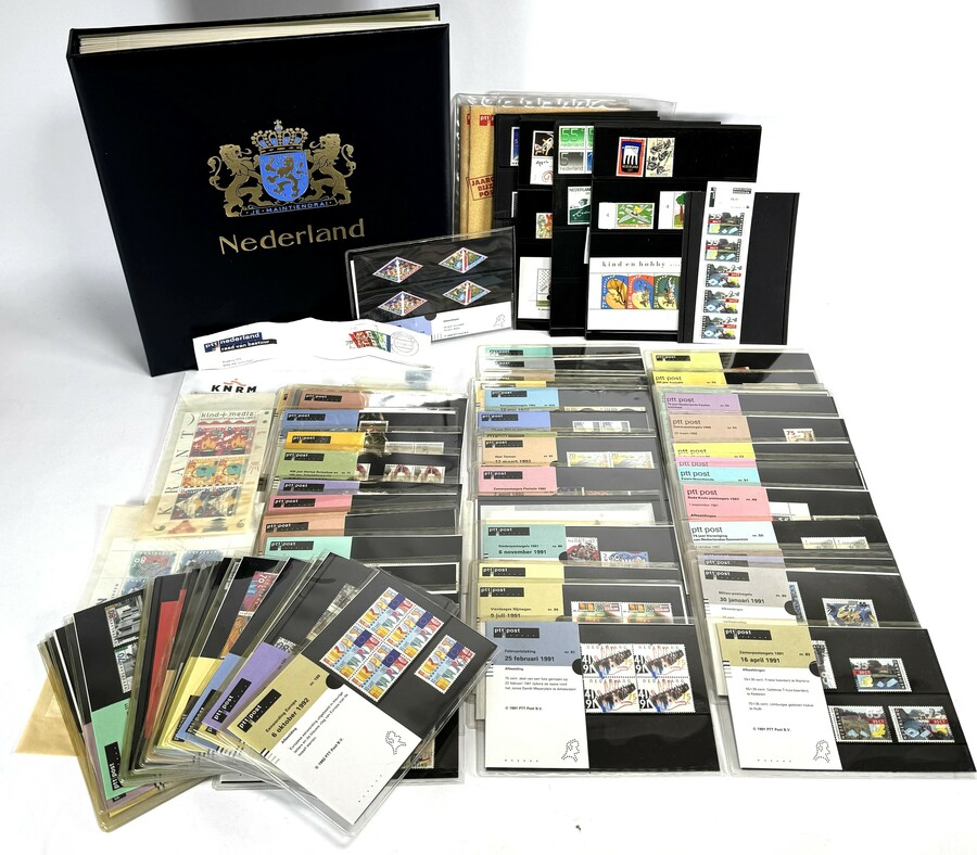 Nederlandse postzegels uit de postmoderne periode, met PTT Post-jaaruitgaven, postzegelmapjes, insteekkaarten en een album Nederland. Zichtbaar zijn thematische emissies, blokken, series en een eerstedagenvelop, merendeels geordend in losse presentatiemappen en transparante houders. De samenstelling dateert hoofdzakelijk uit circa 1980–1992.