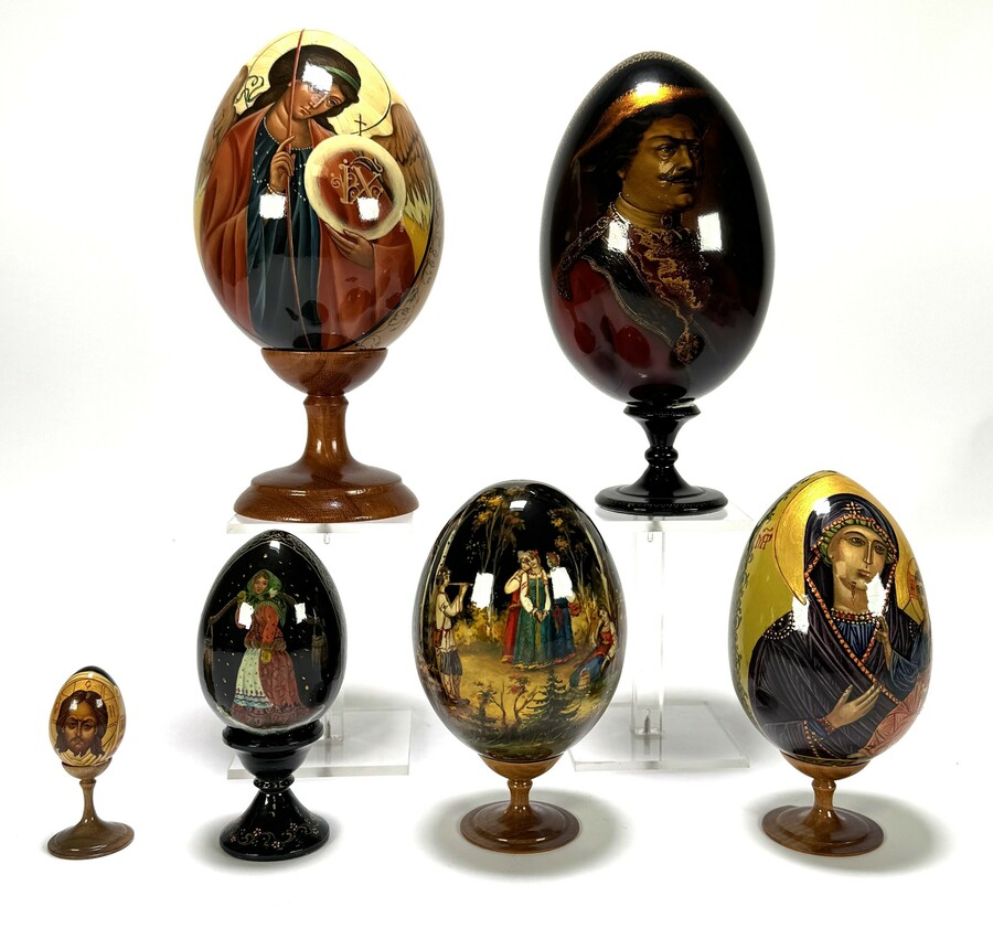 Zes Russische beschilderde houten eieren, uit lindenhout, gedateerd eind 20e eeuw. De verzameling toont diverse religieuze iconen, waaronder Christus en de Moeder Gods, een portret van Peter de Grote en Russische folklore. De decoraties zijn uitgevoerd in tempera met gouden accenten en florale motieven. Alle eieren staan op gedraaide houten voetstukken en passen binnen de folk art traditie.