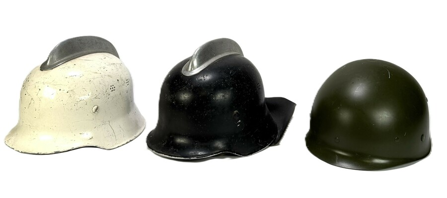 Drie helmen van diverse West-Europese diensten, vervaardigd uit geperst staal met lederen binnenwerken. De verzameling bevat een witte helm met metalen kam, een zwart Adrian helm typerend voor civiele bescherming en een olijfgroene militaire helm. Datering omstreeks 1940–1955 en een Europese herkomst.