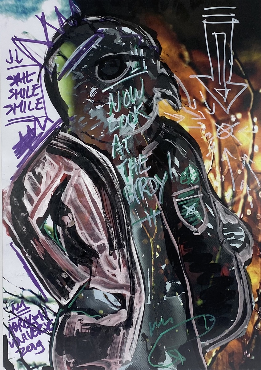 Gemengde techniek op papier door A Broken Universe (Ecuadoraanse kunstenaar, gevestigd in Nederland), uitgevoerd in acryl, spuitverf en inkt over fotoprint. Getiteld “Now Look at the Birdy”, gesigneerd en gedateerd 2019. Het werk toont een hybride vogelmensfiguur in expressieve Street Art stijl met tekstuele elementen en graffiti-achtige lijnen. Uitgevoerd in een zilverkleurige lijst.
