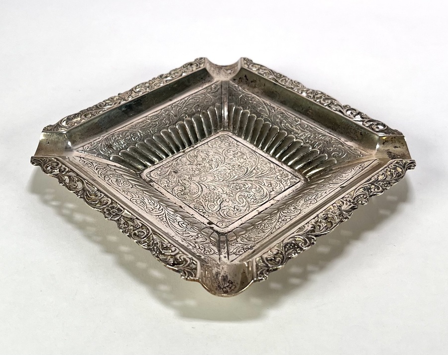 Zilveren asbak vervaardigd uit Nederlands tweede gehalte zilver. Het vierkante model toont een centraal tableau met gegraveerde florale motieven en een gedreven, geribbelde wand. De onderzijde is gemerkt met het lopende leeuw 2, minervakop en de jaarletter J (1944).