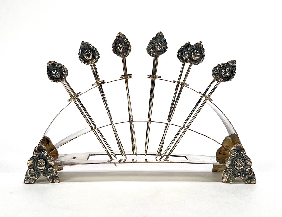 Zilveren cocktailprikkers uit circa 1950, vervaardigd uit 800/1000 zilver. De twaalf cocktailprikkers zijn uitgevoerd met gegoten roosmotieven op de stelen, passend bij de Hildesheimer Rose stijl. De prikkers rusten in een bijbehorende halvemaanvormige houder met opengewerkte details en rijk gedecoreerde pootjes. Het tafelzilver draagt het gehaltestempel 800 en heeft een Duitse herkomst.