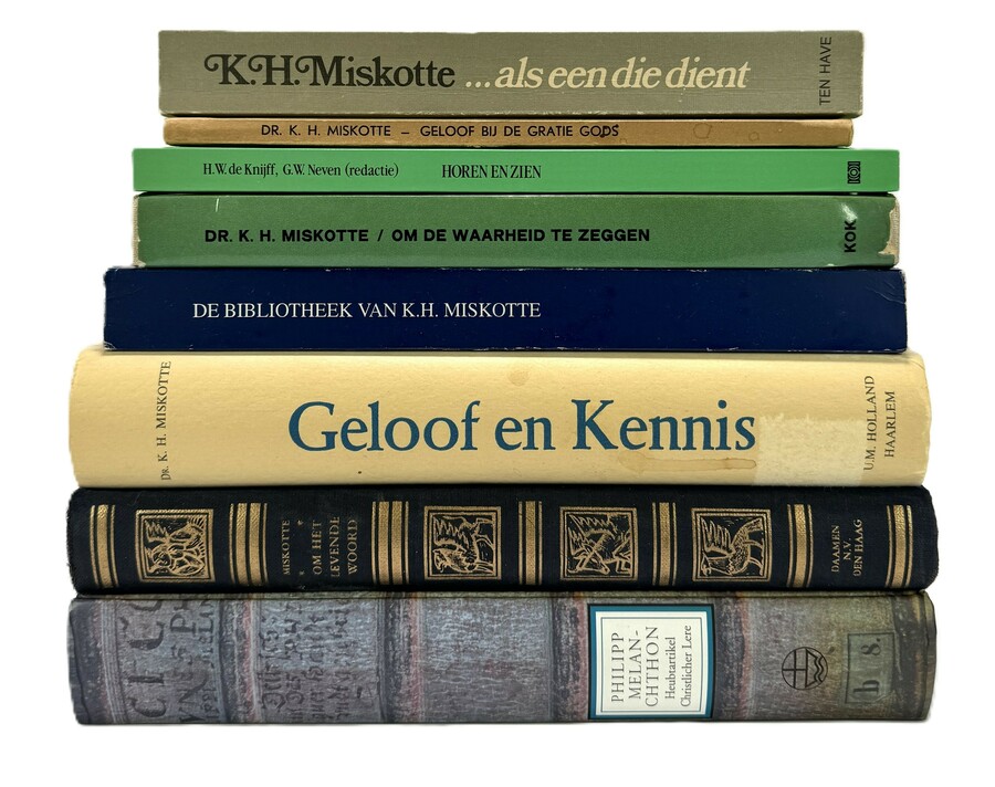 Boeken van K.H. Miskotte en Philipp Melanchthon, met linnen en kartonnen banden. De verzameling theologische werken bevat titels als 'Geloof bij de gratie Gods' en Melanchthons 'Heubtartikel Christlicher Lere'. De uitgaven dateren uit de periode 1946–1975 en hebben een Nederlandse en Duitse herkomst.