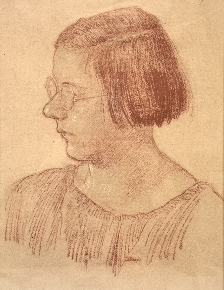 Portrettekening in krijt op papier door Reinhart Dozy (1880–1947), ca. 1920–1935, voorstellende een jonge vrouw met bril in profiel. Gesigneerd midden onder, de tekening is ingelijst in een houten lijst.