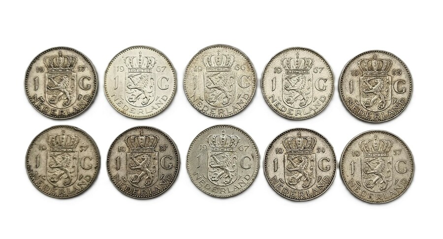 Tien zilveren guldens van Ludwig Oswald Wenckebach (1895–1962), vervaardigd uit zilver (720/1000). De voorzijde toont het portret van Koningin Juliana naar rechts, terwijl de keerzijde het gekroonde Nederlandse rijkswapen tussen de waarde aanduiding weergeeft. De munten uit de periode 1954–1967 hebben een Nederlandse herkomst.