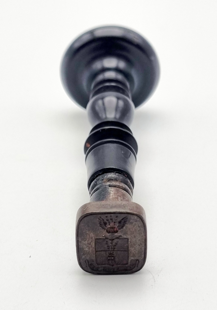 Lakstempel uit de neoclassicistische periode, vervaardigd uit messing met een gedraaide stam van ebbenhout. De rechthoekige stempelplaat toont een gestoken familiewapen voorzien van een adelaar als helmteken en het Latijnse devies Nil Sine Deo (niets zonder god). De lakstempel heeft een balustervormige greep met fijne profileringen en dateert uit de 19e eeuw.