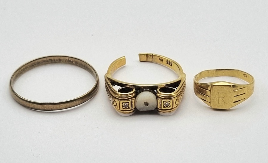 Twee 14 karaat gouden ringen gemerkt 585 en één ring getoetst 8-karaats. Het lot omvat een signetring met initiaal R, een smalle bandring en een ring met witte steen en kleine accenten in opengewerkte zetting. Datering 20e eeuw.