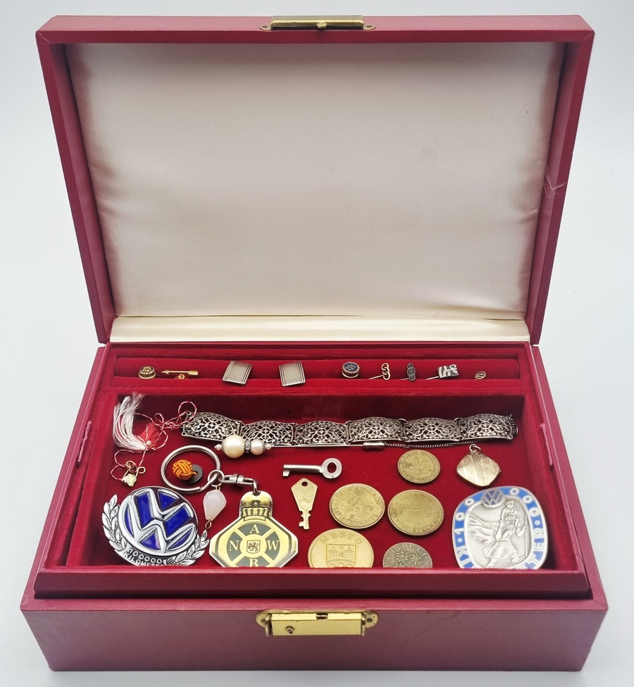Rood sieradenkistje met gemengde inhoud, samengesteld uit onder andere manchetknopen, dasspelden, reversspelden, penningen en een opengewerkte schakelarmband. De verzameling heeft een overwegend Nederlands en Duits karakter en dateert grotendeels uit het midden en derde kwart van de 20e eeuw.