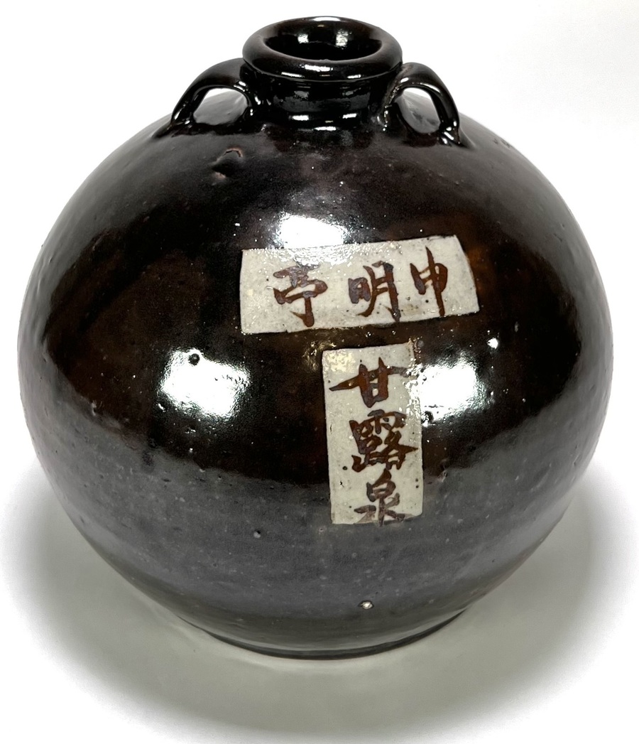 Vaas in Japanse stijl, vervaardigd uit steengoed met gedraaid corpus en donker bruin glazuur. De vaas heeft een afgeplatte bolvormige lichaam, een korte cilindrische hals met twee kleine lusoren en Japanse tekens op de voorkant. De vaas dateert uit de tweede helft van de 20e eeuw en heeft een Japanse herkomst.