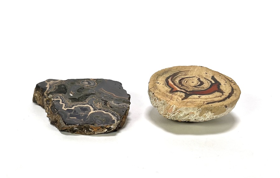 Paar stenen bestaande uit een gepolijste agaatgeode en een schijf versteend hout. De agaat toont karakteristieke concentrische banden in grijstinten en zwart, terwijl het versteende hout duidelijke botanische groeiringen en minerale kristallisatie vertoont. Beide exemplaren zijn aan de bovenzijde vlak geslepen en hoogglans gepolijst om de interne structuur te accentueren. Zuid-Amerikaanse herkomst.