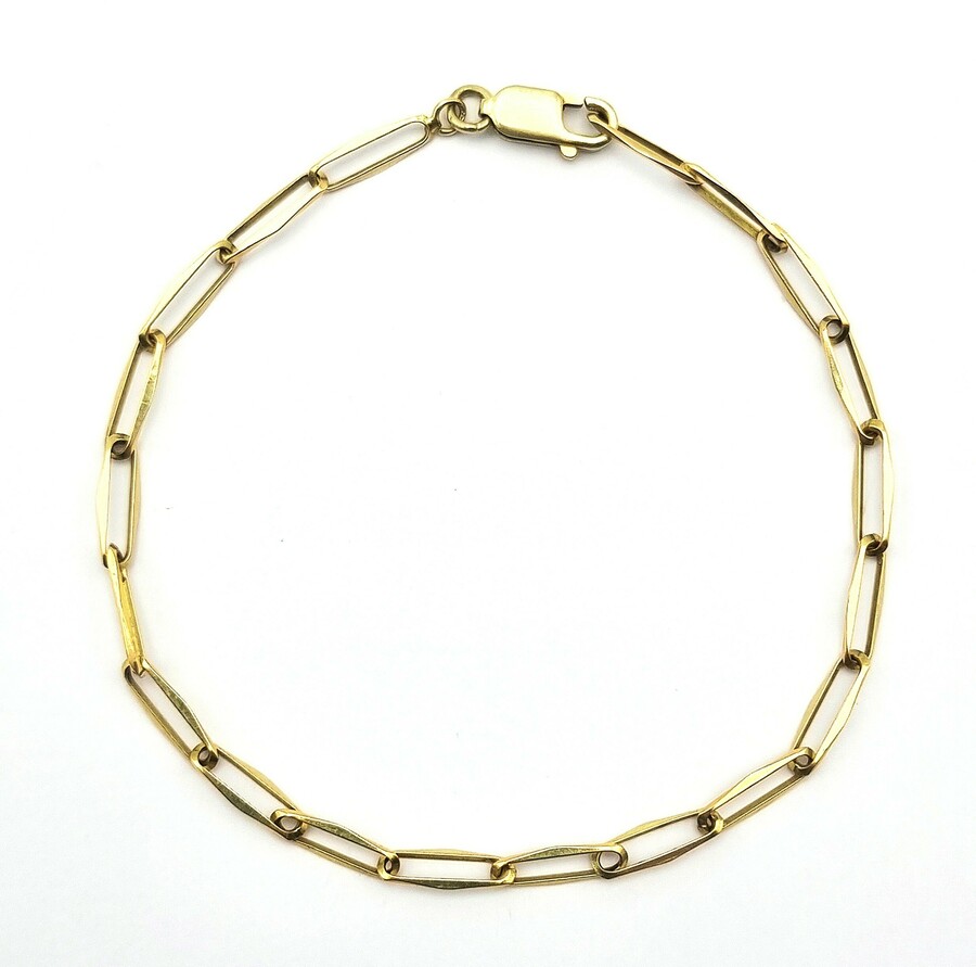 Gouden 14-karaats armband uitgevoerd met langwerpige gefacetteerde schakels, het zogenaamde paperclip-ontwerp. Het sieraad is vervaardigd uit geelgoud en gemerkt met 585 goudkeurmerk op de karabijnsluiting. Datering circa 2000.